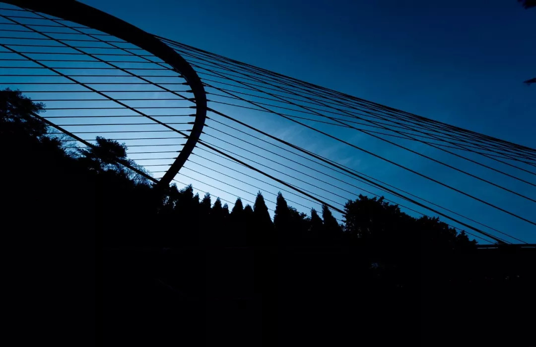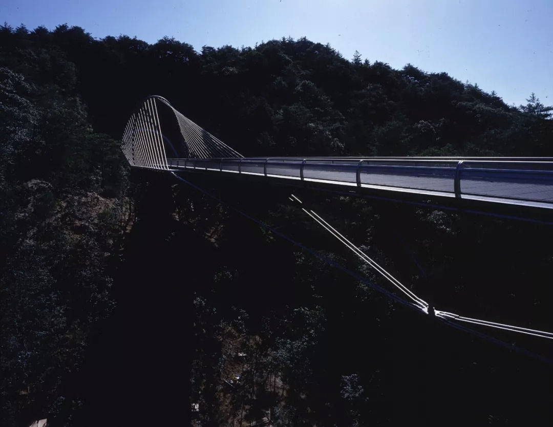 横跨山谷的吊桥采斜张桥设计,没有深入谷底的桥墩,纯粹用钢索的力量拉起整座吊桥。44条钢索从洞口发散,射向天空,将蓝天切成一弧椭圆,给原始山林注入现代感。