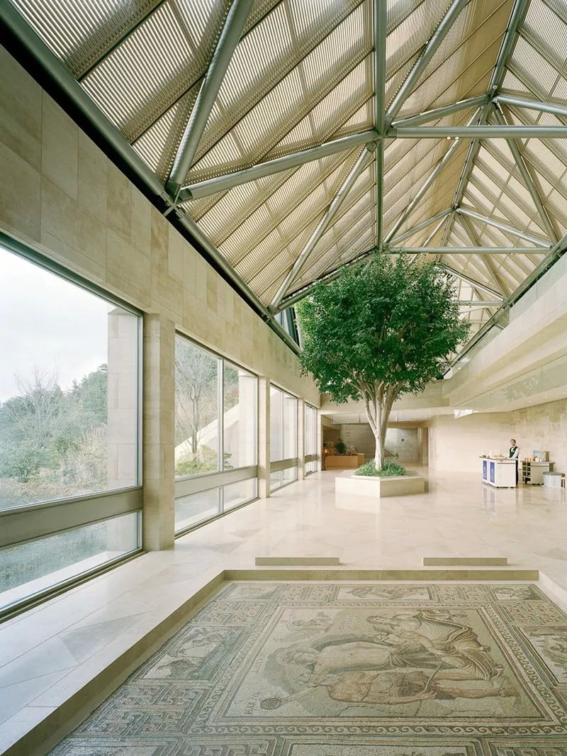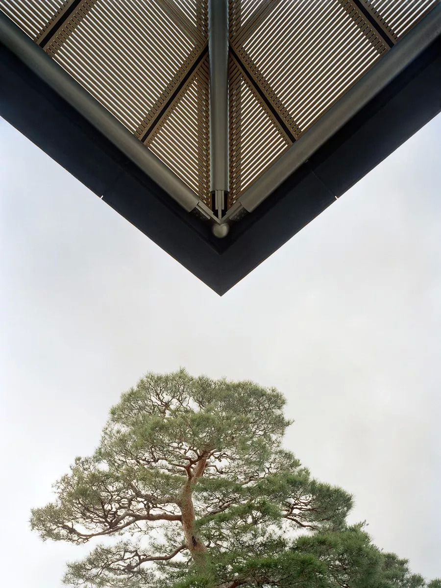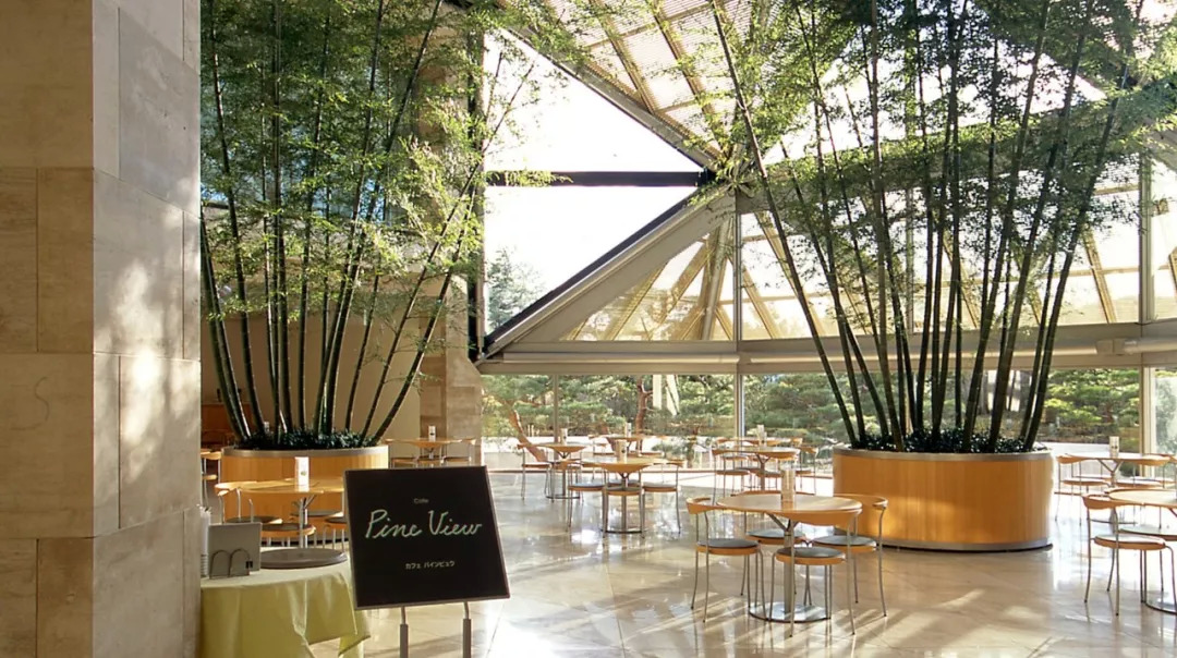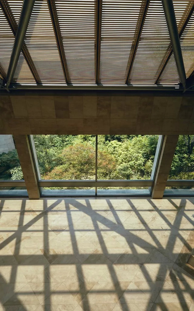 美术馆入口大厅正面所对的窗户,采用了日本传统屏风形状的一组落地玻璃外墙,窗外正是贝聿铭亲自挑选的三棵黄山迎客松,倚崖而立的卓绝风姿,仿佛是一幅巨制的泼墨山水画。