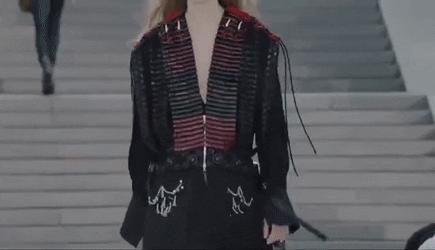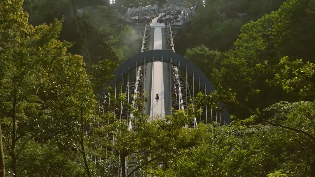 画着日本武士妆容的模特儿缓缓步出长长的山洞,穿过洞口的弧形结构,踏上横跨峡谷的吊桥时,两旁散起的干冰仿佛山岚缭绕,引领着她们进到另一个世界,在绿树葱茏、山高水深的峡谷上空缥缈而空灵。