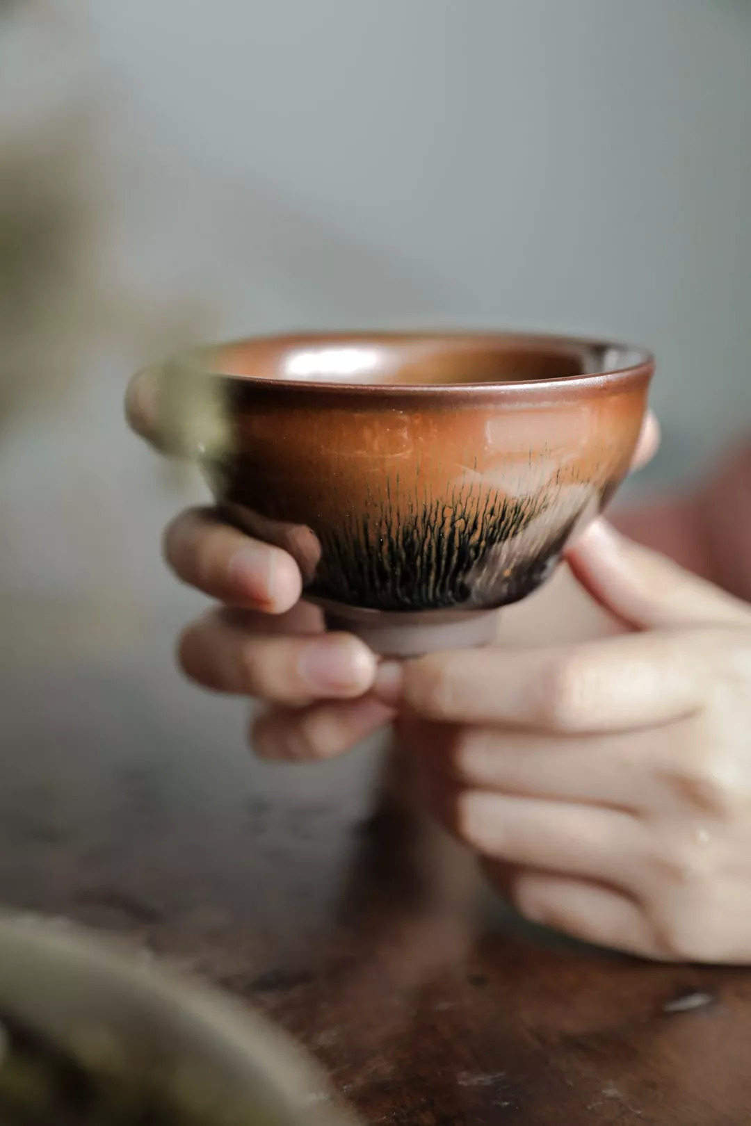 宋徽宗赵佶在《大观茶论》里说:「盏色贵青黑,玉毫条达者为上,取其焕发茶采色也。」他说的便是建盏里的最流行的品种——兔毫盏,因盏身内外都有棕色或者铁锈色条纹,最好的是银光色的细条纹,形似兔毛,因此称为兔毫盏。但是兔毫盏并非是建盏中的极品。