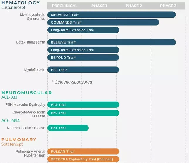 公司主要管线为Luspatercept,一种用于TGF-β家族的促血红细胞生成药物,用于治疗或缓解MDS、β型地中海贫血以及骨髓纤维化引起的贫血并发症,致力于减少患者的输血负担。其中在MDS患者和β地中海贫血患者上进行至临床三期。该管线与新基签订有授权协议。