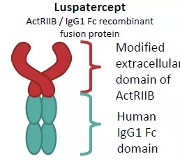 Luspatercept是一种红细胞成熟剂,可中和选择的TGF-β超家族配体,抑制异常的Smad2 / 3信号传导并增强晚期红细胞生成。分子设计上,Luspatercept是由ActRIIb和IgG1部分结合而成的融合蛋白,如下图所示: