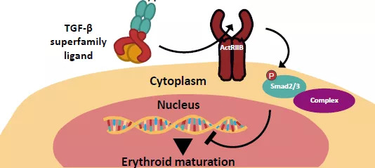 Luspatercept作为配体陷阱(ligand trap)通过中和配体调控Smad2/3通路,从而促进晚期红细胞前体细胞的分化,以及血红细胞的成熟,这个作用机制不同于在红细胞生成的早期增殖阶段起作用的红细胞生成素EPO。(如Epogen)