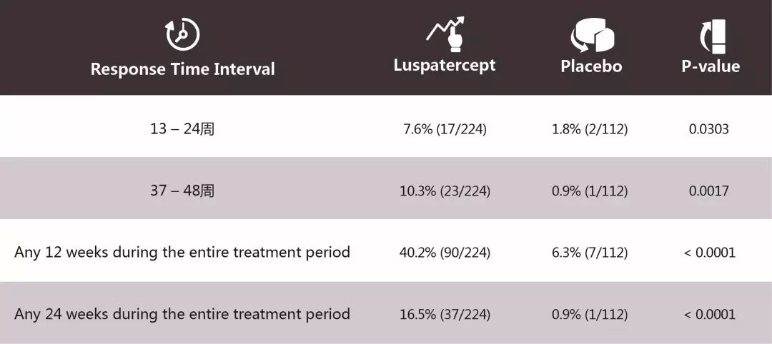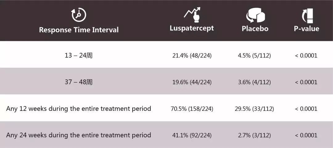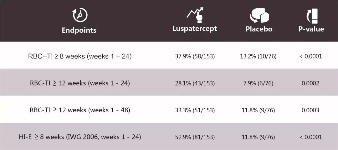 针对输血依赖型地贫患者的BELIEVE临床是一项3期,随机,双盲,安慰剂对照的多中心研究,比较Luspatercept +最佳支持治疗(BSC)与安慰剂+ 最佳支持治疗在需要定期红细胞输血的成人β地中海贫血患者中的疗效,采用每21天皮下注射给药。 BELIEVE试验的主要终点定义为13-24周期间RBC输血负荷减少33%(减少32单位红细胞),与给药前的12周基线进行对比。主要次要终点包括:第37-48周RBC输血负荷减少≥33%,第13-24周输血负荷减少≥50%,第37-48周输血负荷减少≥50%,输血平均变化第13-24周的负担(对比安慰剂减少-1.35单位红细胞)。主次要终点表现如下表: