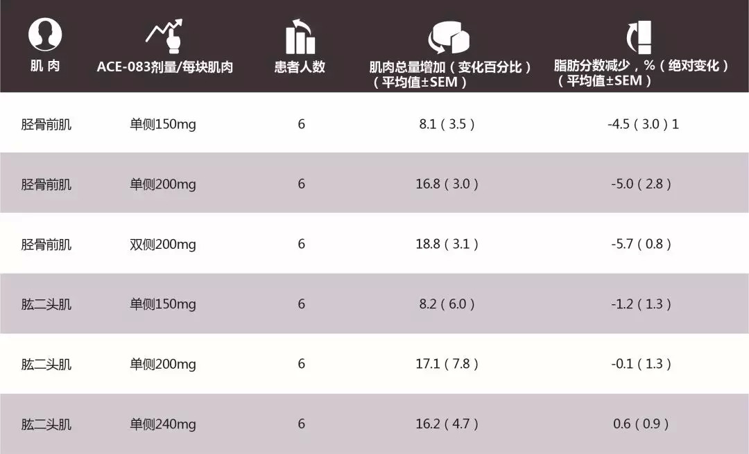 2018年XLRN公布了SHD患者2期临床第一部分的初步结果,共进行了六组不同的试验,每组六人,试验为单臂开放式。ACE-083采用单侧或双侧肌肉注射,每三周一次持续12周。数据如下: