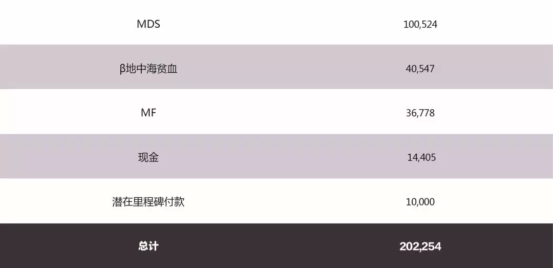 2011年8月,Celgene在签订Luspatercept协议时向XLRN支付了2500万美元,截至2018年12月31日,XLRN已经获得了1.096亿美元的里程碑付款,总共可能的里程碑付款为2.17亿美元。自2013年1月1日起,Celgene负责支付luspatercept计划全球开发成本的100%,Celgene将负责全球所有商业化成本。这意味着Luspatercept在推广时将会享受新基在血液病上的深厚积累以及销售渠道。