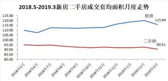 截止2019年3月,新房成交的户型套均为115㎡,二手房为90.51㎡。并且,这个差距有持续扩大的趋势。这就更加坐实了,目前买卖二手房的人群,基本为刚需群体。