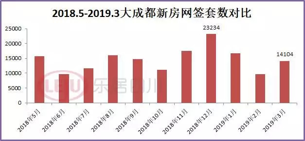 从新房端口的成交数据来看,2019年3月份大成都网签成交新房约共计14104套,套数环比上涨了约45.8%。抛开2月节假日,其实今年3月的新房成交量,相较于完整的2018年11月-2019年2月是有少量下滑的。
