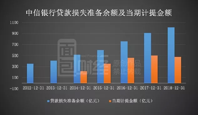通常来说,当银行的不良贷款余额增多时,为了提高抗风险能力,其贷款损失准备的计提金额也会相应的增多,从而提高银行的拨备覆盖率。然而,从中信银行的数据来看,不良贷款余额持续增多,拨备覆盖率却出现了下滑。换句话说,2018年中信银行的贷款损失准备计提要么出现了下降、要么就是维持不变或者是增速赶不上不良贷款余额的增速,才会导致拨备覆盖率出现下滑。