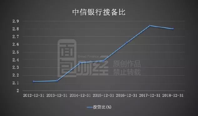 年报显示,截至2018年底,中信银行的拨贷比为2.8%,较上年同期下降了0.04个百分点。整体来看,中信银行的拨贷比整体呈上升趋势,虽然2018年出现微降,但仍处于高位,并满足将按要求。