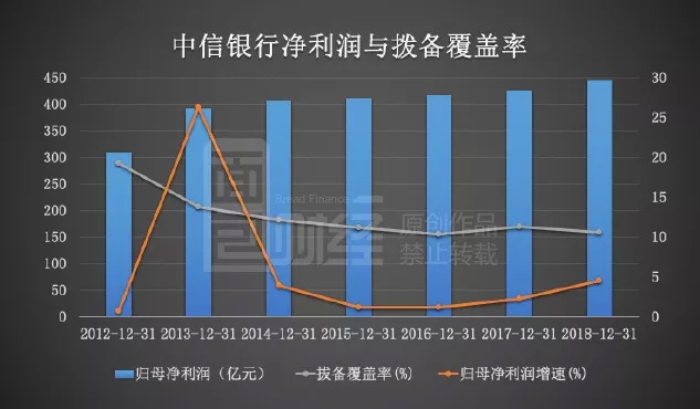 这个影响会有多大呢?可以做一个假设:如果中信银行2018年底的拨备覆盖率维持在上年末的水平,会吞噬多少利润?