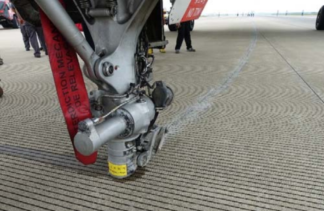 该飞机的前起落架由于受到猛烈撞击,导致其两个轮胎脱落,其他结构也被严重损坏。