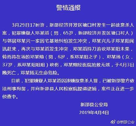 湖南新邵县公安局今天发布警情通报,3月29日17时许,新邵经济开发区塘口村发生一起故意杀人案,犯罪嫌疑人邓某滔(男,65岁,新邵经济开发区塘口村人)与邻居邓某兴一家因宅基地纠纷发生冲突。邓某兴儿子邓某阳闻讯赶来,再次与邓某滔发生冲突,邓某滔持刀追砍邓某阳未果,转而将在场的邓某煊(男,6岁,系邓某阳之子)、邓某扬(女,37岁,系邓某阳姐姐)砍伤,邓某煊经医院抢救无效,于4月3日晚死亡,邓某扬无生命危险。