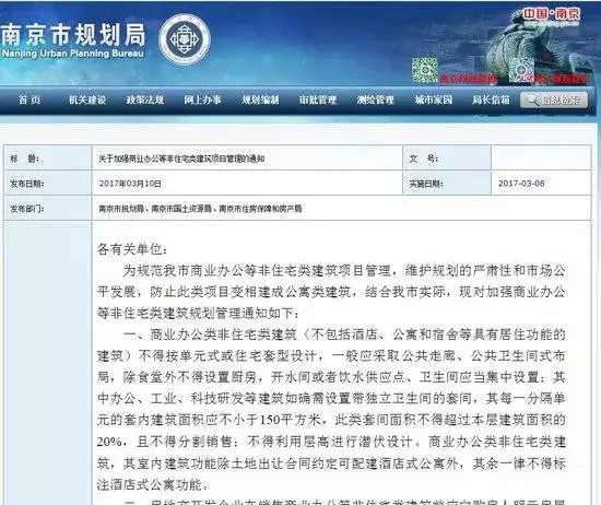 对于这种商办改公寓,南京是明令禁止的!早在2017年,南京市规划局联合南京市国土资源局、住房保障和房产局发布《关于加强商业办公等非住宅类建筑项目管理的通知》,规定商业办公类非住宅类建筑,其室内建筑功能除土地出让合同约定可配建酒店式公寓外,其余一律不得标注酒店式公寓功能。