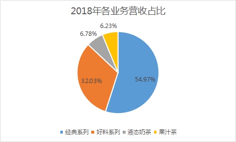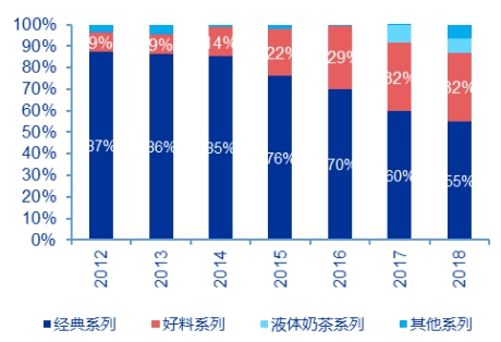 经典系列奶茶始终是公司的主要产品系列,但由于公司调整产品结构的效果逐渐显现,经典系列奶茶收入占比从2012 年的 87%降至 2018 年的 55%。中高端的好料系列产量扩大,销售收入呈现稳定增长态势。
