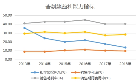 从这里我们可以非常清晰的看到,为何其利润增速会远远小于营收增速了,香飘飘核心的盈利指标--扣除非经常性损益的加权净资产收益率(ROE)一直呈连年下滑态势。