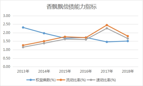 整体来看,香飘飘偿债能力表现良好。权益乘数即杠杆倍数,近年来一直呈下降态势,香飘飘整体的负债开始缩减。同时速动比率始终维持在1倍以上,流动比率也保持在2倍附近,短期偿债能力良好,没有太大的债务偿付风险。