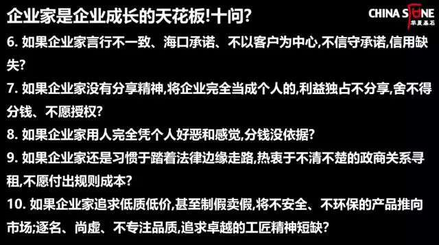 如果企业家还是机会主义导向,逮住一个机会、一个项目,捞一把就走,还是捞浮财的心理,不愿意为人才、管理、品牌去作投入,去为这些能长期支撑企业发展的软实力作投入,那么这个企业还能持续发展,还能跨越成功的陷阱吗?在一个企业里,如果老板言行不一致,老板不以客户为中心,那么这个企业能建立信任体系吗,在市场竞争中能赢得客户的信任和合作伙伴吗?显然不能。