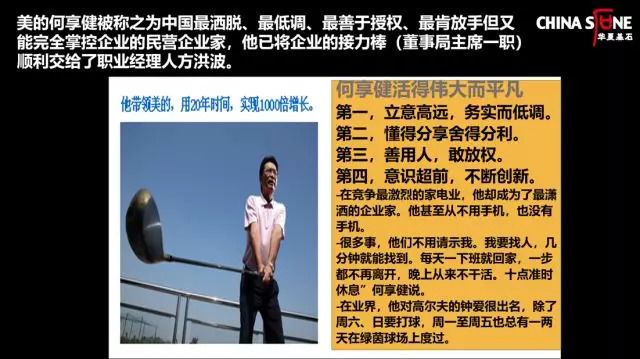 在中国改革开放后的第一代企业中,能顺利交出企业的领导交接棒,而且第二代领导能保持企业的持续发展,我认为何享健是独一无二做到了这一点。他是一个立足高远、务实低调的企业家,美的是一个做到了3000亿的大企业,但很少有人知道何享健。他把工作和生活安排得从容不迫。1997年开始我就和何享健打交道,他生活非常有规律,每天10点睡觉,早上6点起来跑步,每周打两次高尔夫,他到现在不用手机,更不用微信。