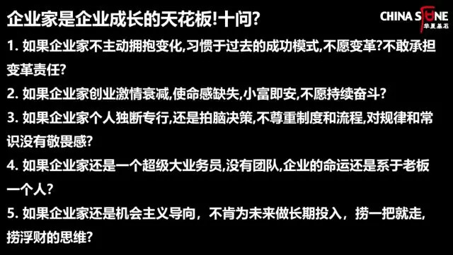 中国企业家如何实现自我超越,突破成长的瓶颈,企业如何实现转型?我曾经提出过“中国企业的八大问题”,企业家必须在这八个方面完成系统思考,实现变革和突破。