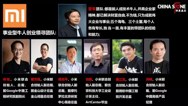 华为和小米的成功,都在于它们打造了一个有力的领导团队。小米用8年时间就创造了一个世界500强,去年的销售收入突破了1800亿,这在中国企业发展史上是一个奇迹。据我的研究,一个企业从创业到成为世界级企业一般至少需要15到20年时间。雷军从创业伊始,就认识到“团队先于个人”,意识到互联网时代的创业不能靠单打独斗,要靠合伙人机制。他打造了一个事业型的牛人领导团队。大家可以看到,雷军组建的这个团队是世界范围内一支令人称羡的队伍,五个“海归”,三个“土鳖”,如林斌、黎万强、周光平、刘德、黄江吉、洪峰这些行业精英,他们来小米都不是为了钱,而是为了共创大业聚到一起。