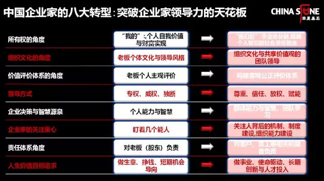 综前所述,我认为中国企业家只有实现了这八大转型,才能突破成长的瓶颈,才能成就受人尊重的伟大企业。