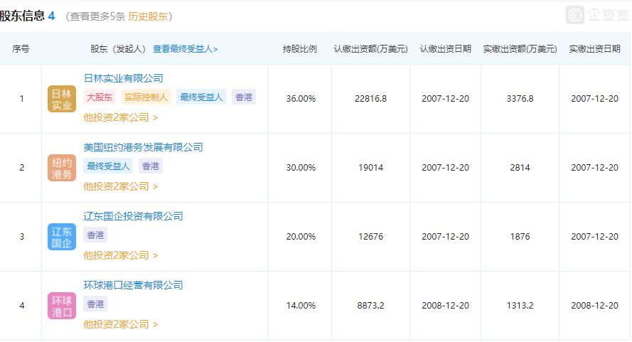 丹东港公开资料显示,丹东港为在香港上市,由公司的实际权益人在香港设立了丹东港集团(香港)有限公司,并通过100%持股辽东国企投资有限公司(香港)、日林实业有限公司(香港)、美国纽约港务发展有限公司(香港)、环球港口经营有限公司(香港),持有丹东港的全部权益。