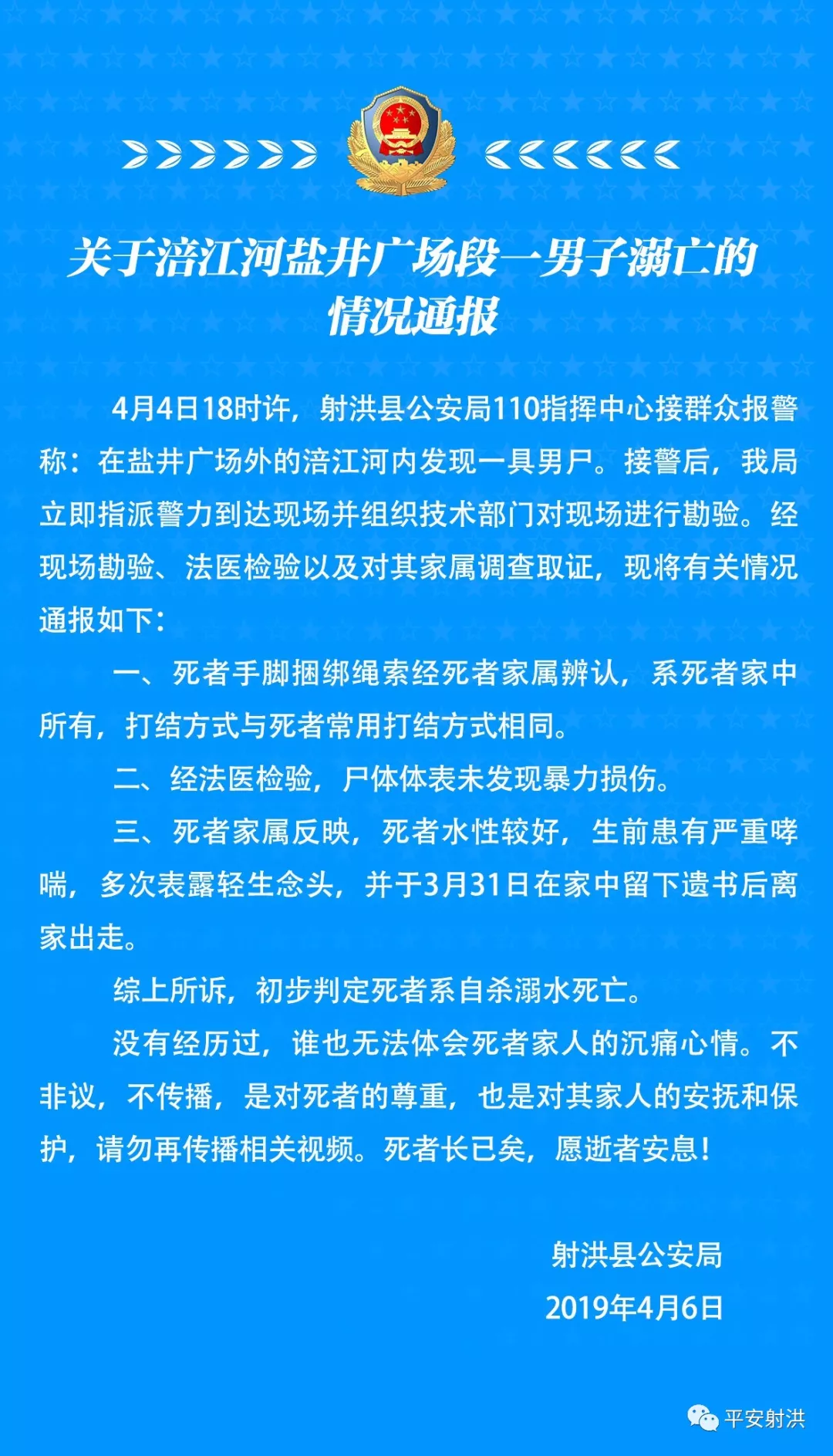 据平安射洪微信公众号通报,4月4日18时许,射洪县公安局110指挥中心接群众报警称:在盐井广场外的涪江河内发现一具男尸。经现场勘验、法医检验以及对其家属调查取证,将有关情况通报如下: