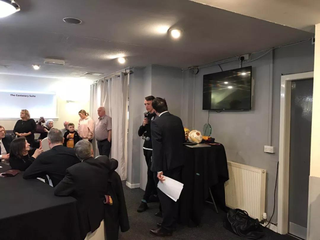 惊喜到了这个份上,居然还没有结束。经过了上半场的闷平,球队在70分钟以后连进三球,取得了比赛的胜利。赛后,我受邀观摩本场最佳球员的颁奖仪式,而一位球迷组织的董事大姐,则专门安排球队的一位核心球员与我合影。原因是,我在赛前一天的采访中被问到喜欢球队哪名球员,当时我就说了队里一名叫Allan Campbell的苏格兰U21国脚,没曾想今日就得以如愿。