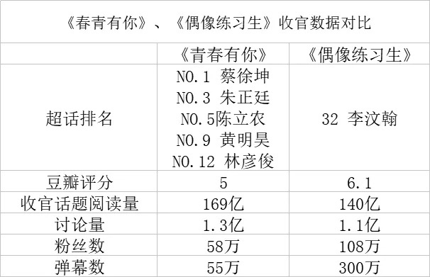 明星资本论对比了《青春有你》和《偶像练习生》的部分数据,除了有《偶练》提前为《青你》造势的阅读量和讨论量之外,脱离《偶练》热度的青你数据全部低迷。截止到一年前,《偶像练习生》的弹幕数高达300万,但《青春有你》目前只有55万。官博粉丝数、豆瓣评分数也相差的明显。