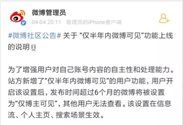 4月4日晚,微博管理员发布公告,“仅半年内微博可见”功能正式在微博上线。通过此功能,用户可主动将发布超过6个月的内容全部隐藏为自己可见,该设置在信息流、个人主页和搜索场景均有效。