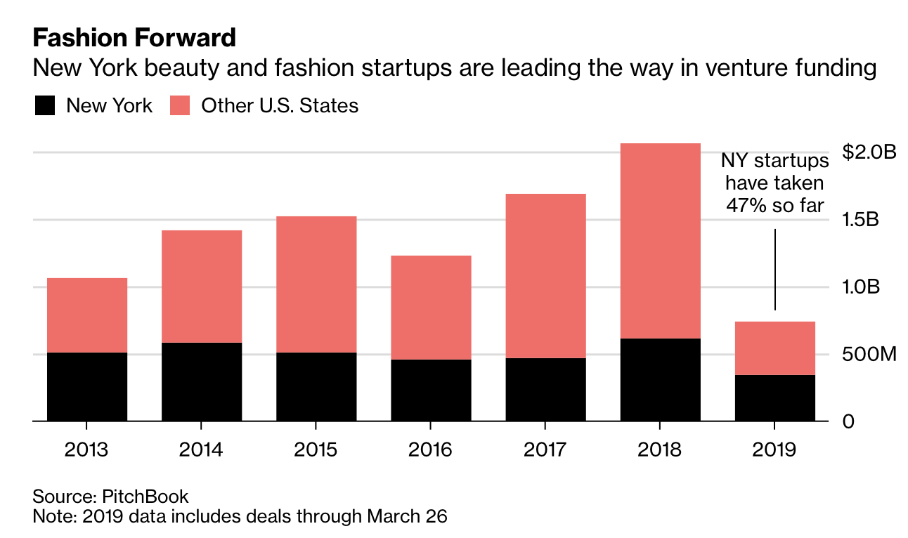 上图:2013~2019年3月26日,纽约和美国其他州的时尚和美妆初创企业风险融资金额增长情况