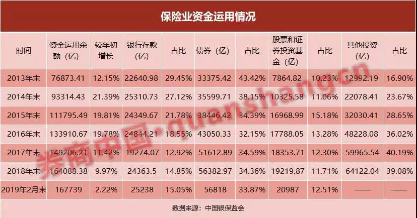 截至2018年底,保险资金规模达16.4万亿,其中11.71%的资金量即1.92万亿元投资于股票和证券投资基金,占A股流通市值的5%。不过截至2019年2月份数据,险资入市资金已经达到20987亿元,“市值”两个月飙升1767亿元,在投资规模中的占比上升至12.51%。
