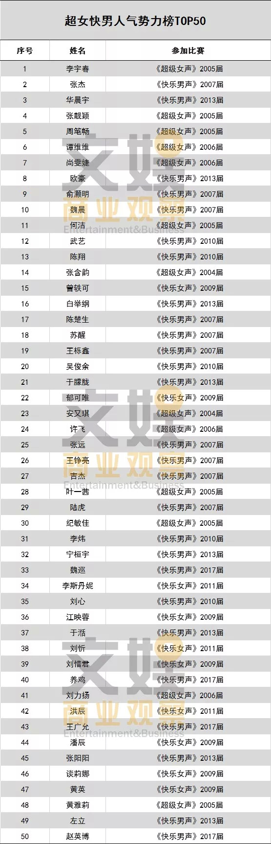 文娱商业观察综合盘点跨越十五年的“超女”“快男”,为您奉上这共计十届选手中的“王中王”,“超女快男”人气势力榜新鲜出炉。