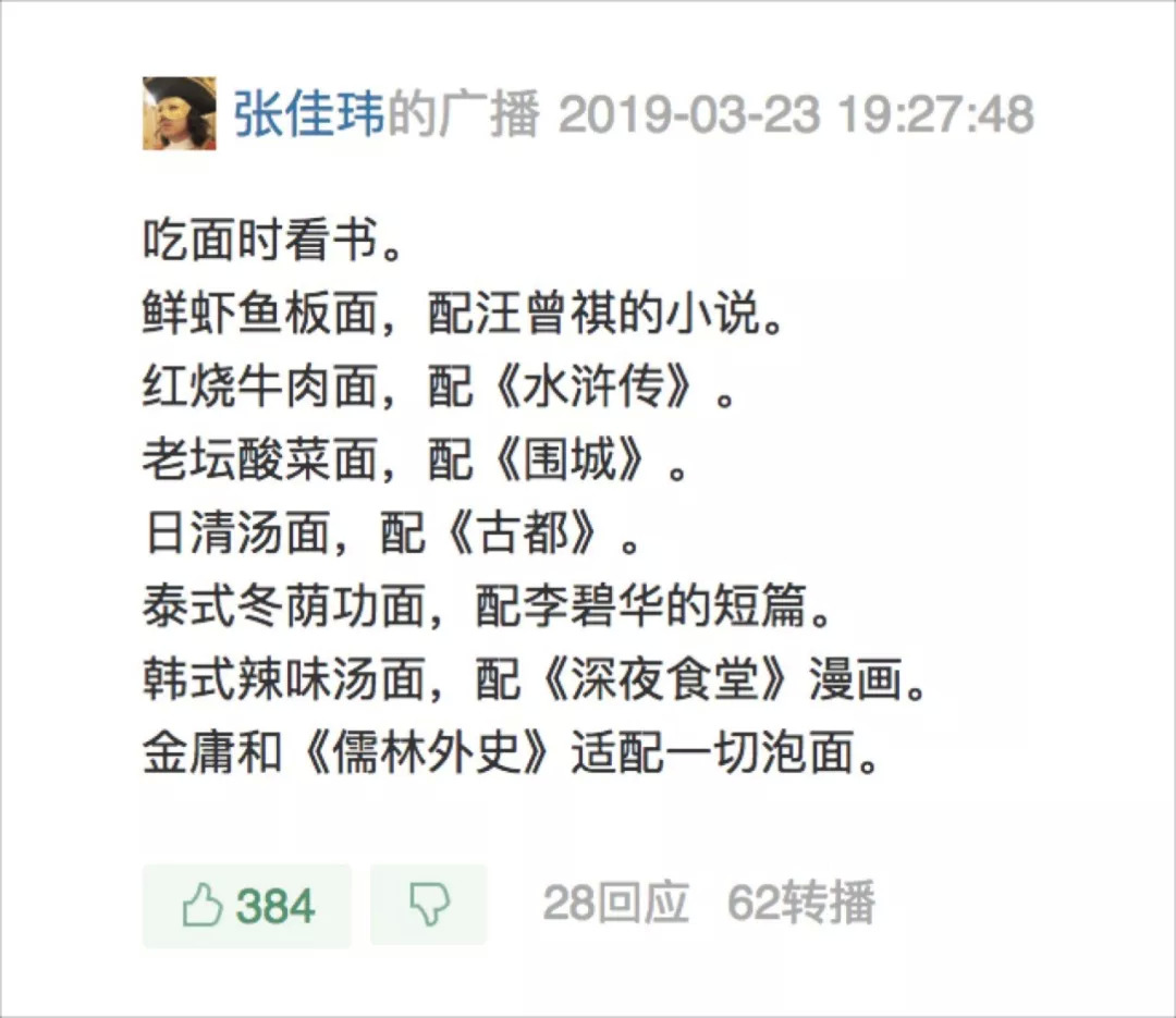 最近,豆瓣网上也流行一个话题“什么样的书面搭配,会带来非凡的泡面口味”,就为“拿什么盖泡面”这件小事注入了文艺的味道: