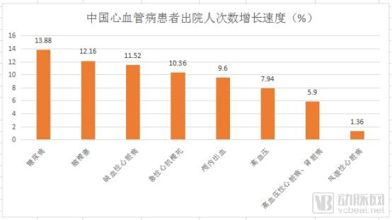 国家心血管中心发布的《中国心血管报告2016》数据显示,2015年,中国医院心脑血管病出院总人次是1887.72万人次,占同期出院总人次数的12.87%。其中,心血管病占6.61%(970.02万人次),脑血管病占6.25%(917.7万人次)。