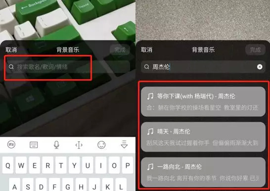 这次更新,微信给出了一个搜索音乐功能,用户可以搜索喜欢的背景音乐添加到视频里。