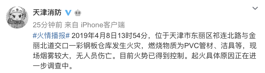 天津市消防救援总队官方微博消息,4月8日13时54分,位于天津市东丽区祁连北路与金丽北道交口一彩钢板仓库发生火灾,燃烧物质为PVC管材、洁具等,现场烟雾较大,无人员伤亡。目前火势已得到控制。起火具体原因正在进一步调查中。