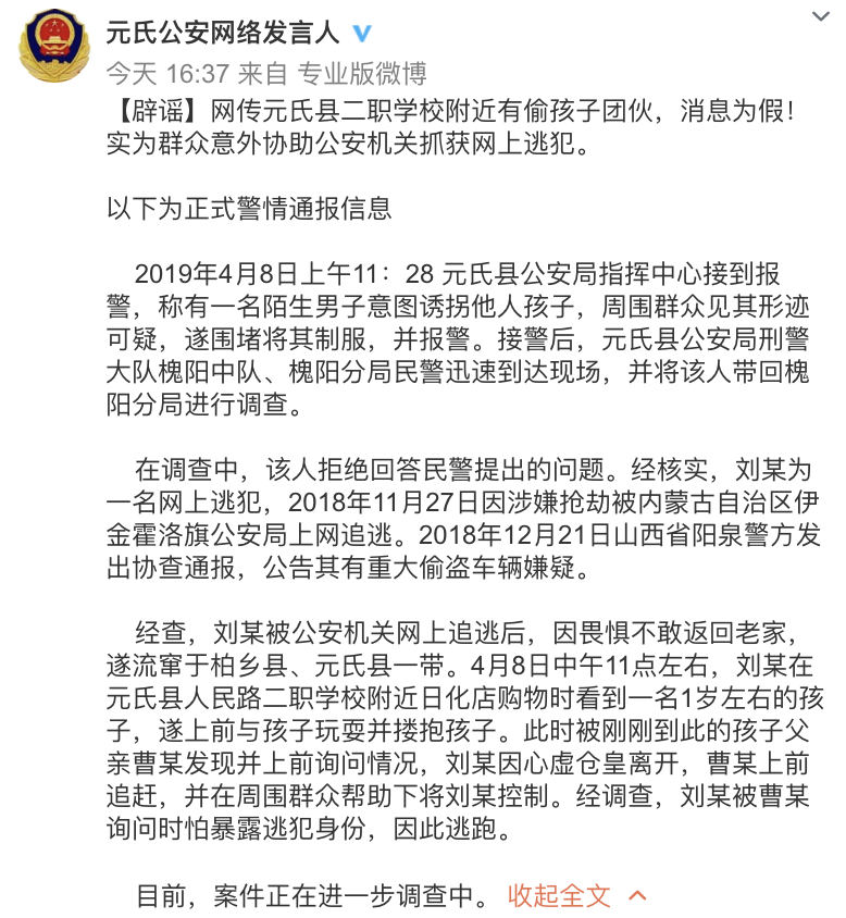河北省元氏县公安局官方微博消息,网传元氏县二职学校附近有偷孩子团伙,消息为假,实为群众意外协助公安机关抓获网上逃犯。