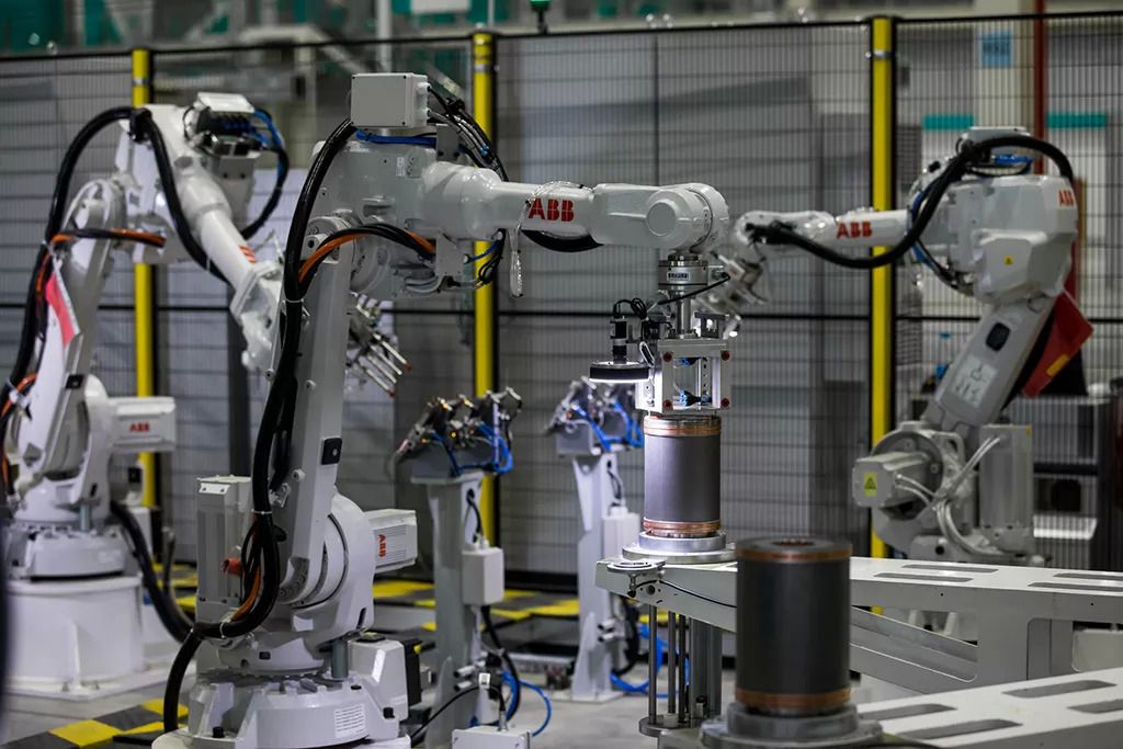 转子二线由ABB公司集成设计与制造,高精度六轴机器人完成铜转子所有配件的组装作业,自动化率100%。其中: