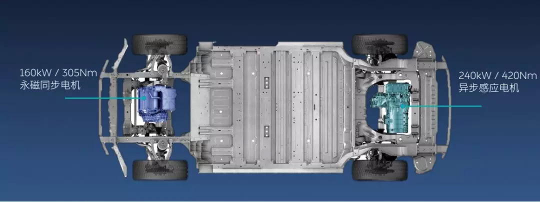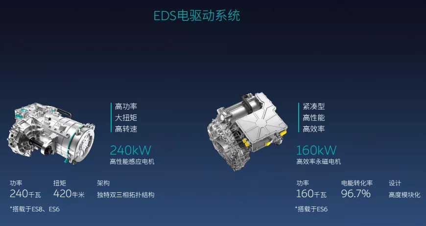 蔚来ES6首发限量版和性能版采用前160kW永磁同步电机、后240kW异步感应电机的组合,整车百公里加速时间为4.7S。