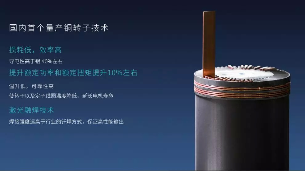 铜转子技术——铜转子导热性比铝转子高出40% ,提升效率减少损耗。制造过程采用激光焊接,成品更加稳定。