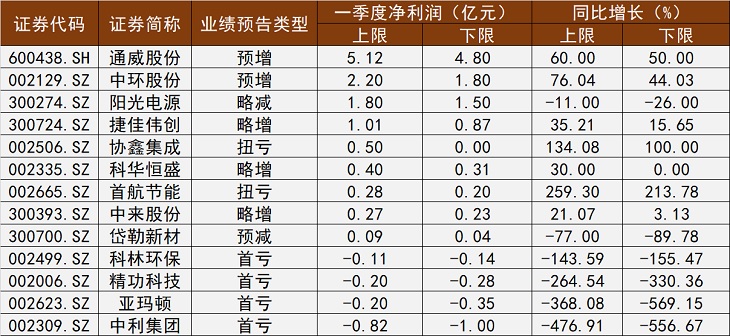 通威股份预测一季度盈利4.80亿元至5.12亿元,同比增长50%至60%;中环股份则预计盈利1.8亿元至2.2亿元,同比增长44%至76%。此外,组件巨头协鑫集成(002506.SZ)则有望实现扭亏,预计盈利0至0.5亿元。