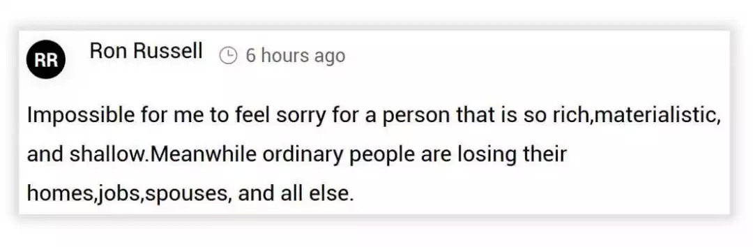 这位叫Ron Russell的网友认为原告Li活该,理由是Li太有钱和肤浅,顺便还感叹一把,普通人正在失业、离婚、买不起房......
