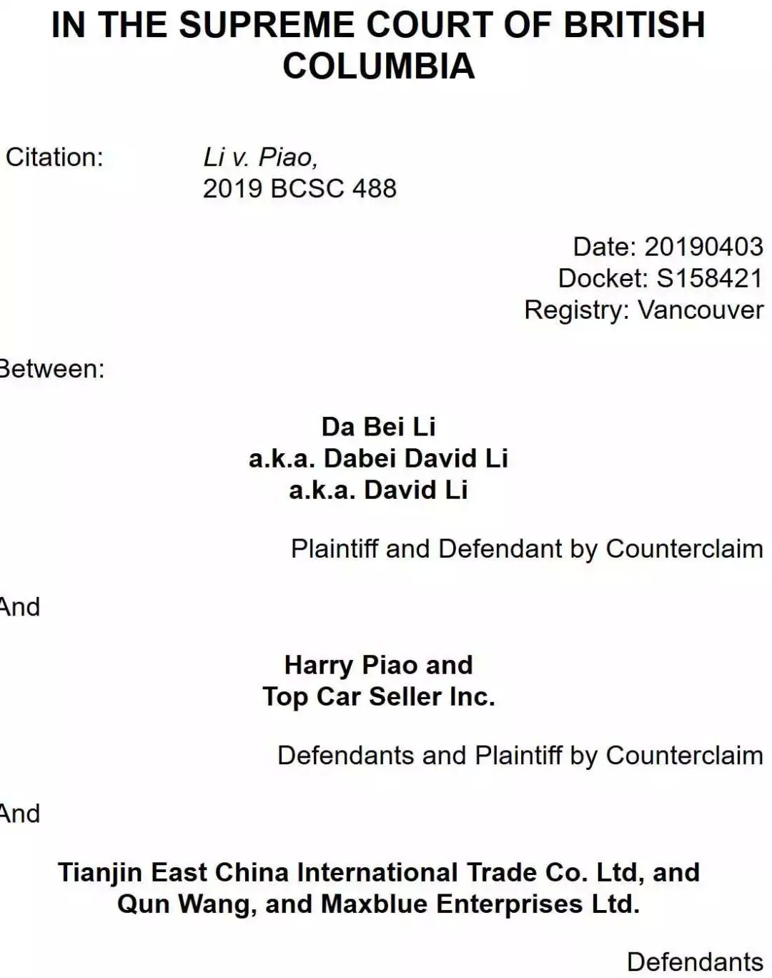 2019年4月,卑诗省最高法院判决,Top Car Seller业主Harry Piao, Maxblue Enterprises业主Qun Wang和他的亲属对Da Bei Li的宝马车以及运费在内的$338,069付全责。Qun Wang必须归还Harry Piao所支付的$42,546运费。