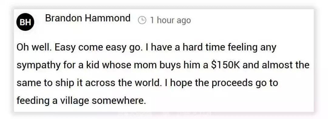 这位叫Brandon Hammond的网友也认为原告Li活该,原因是Li的妈妈出手阔绰给儿子买车,并指出这些钱应该用来救助贫困山村。