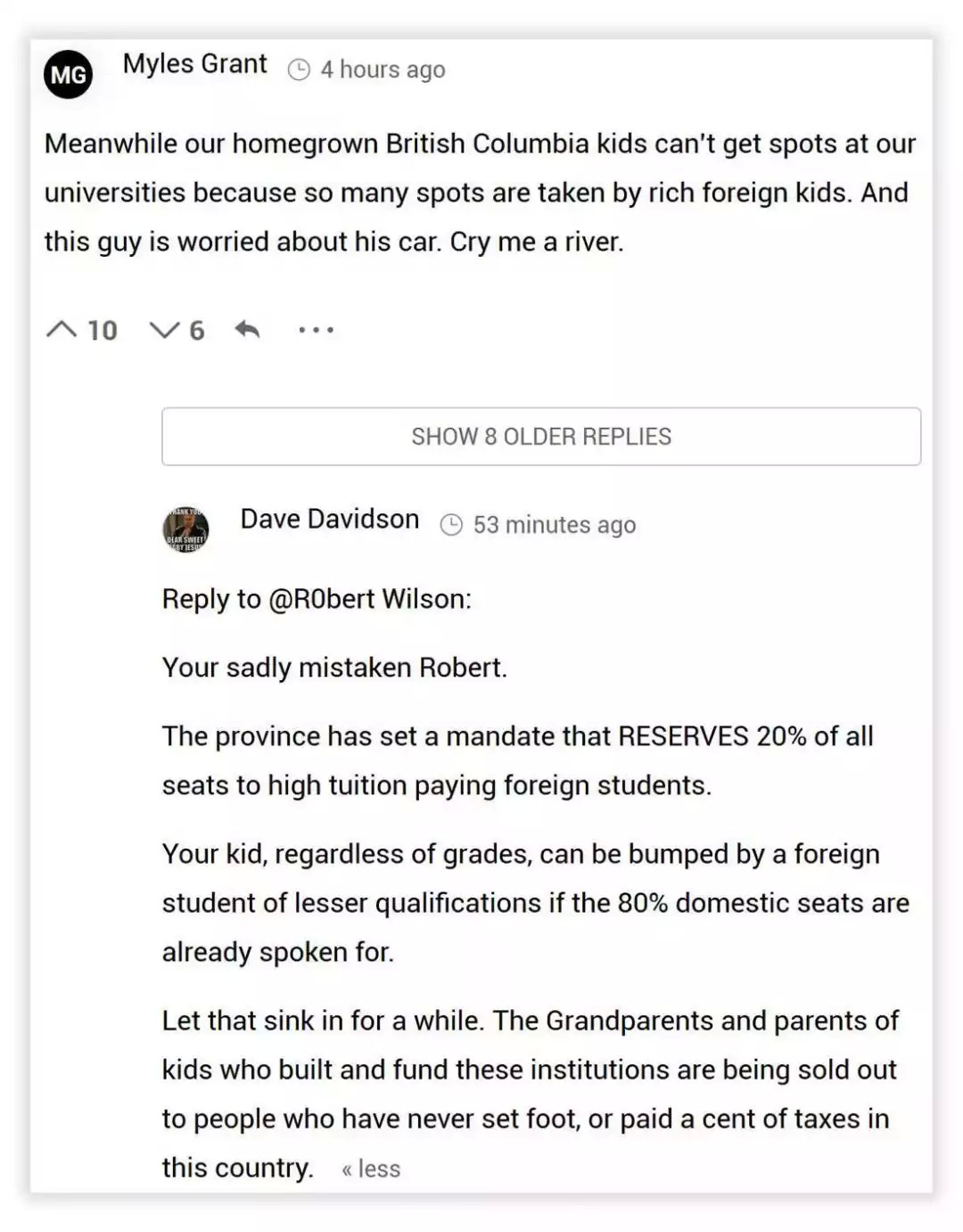 这位叫做Myles Grant的网友为加拿大本地学生被大学拒之门外“泪流满面”,并把责任推给象原告Li这样的“富二代”留学生。然后,一位网友Dave Davidson继续跟“疯”,扬言卑诗省政府“预留”了20%的高校位置给那些不纳税,但可以支付高额学费的留学生,并描绘出一幅加拿大本地学生只能竞争80%的高校录取率的“惨状图”。