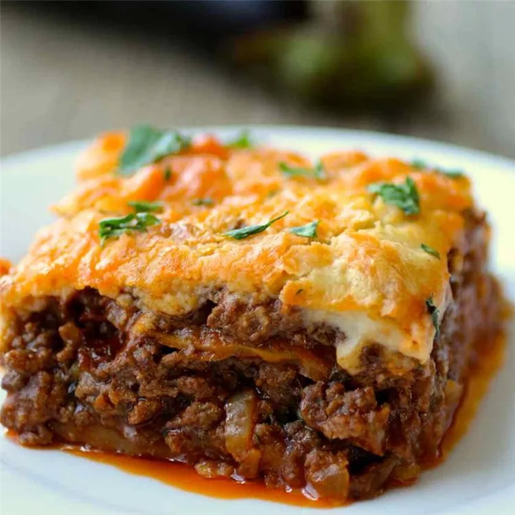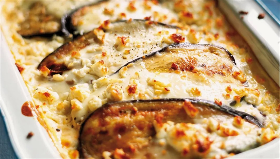 一种以茄子为原料的食物,感觉是希腊式“茄盒”。一层茄子、一层肉碎,覆盖白酱烤制,融合成软糯入口的千层面。上桌前,会撒上一些芝士碎和香菜,增加风味。