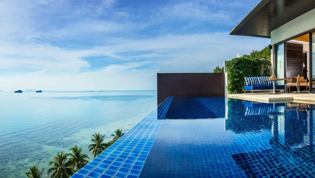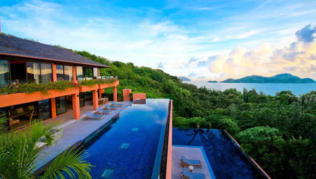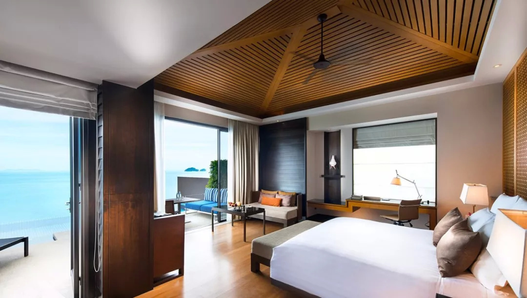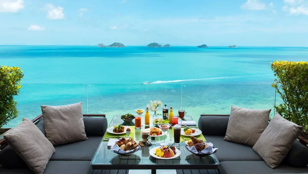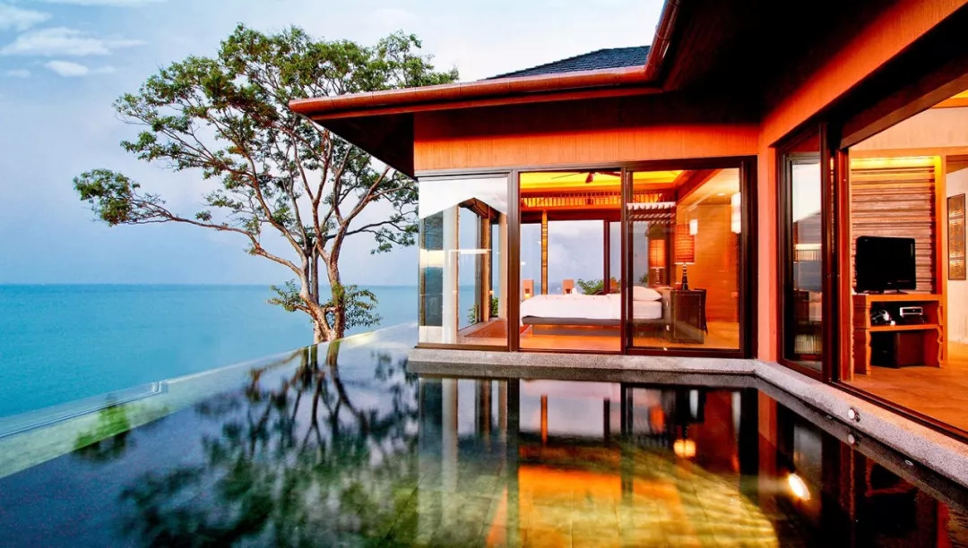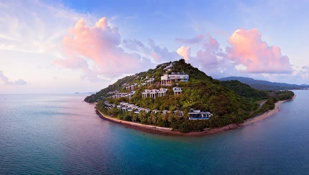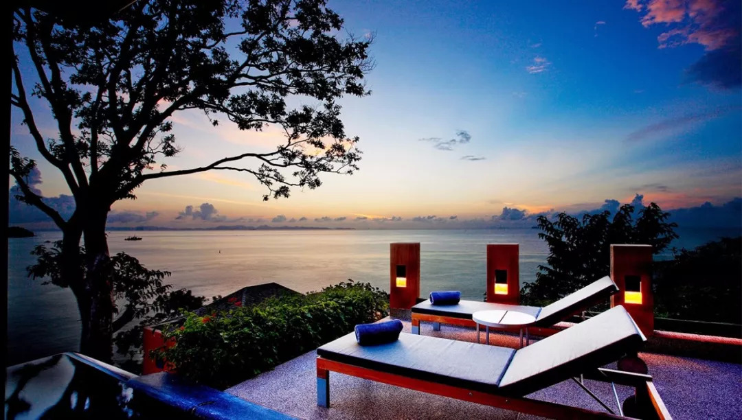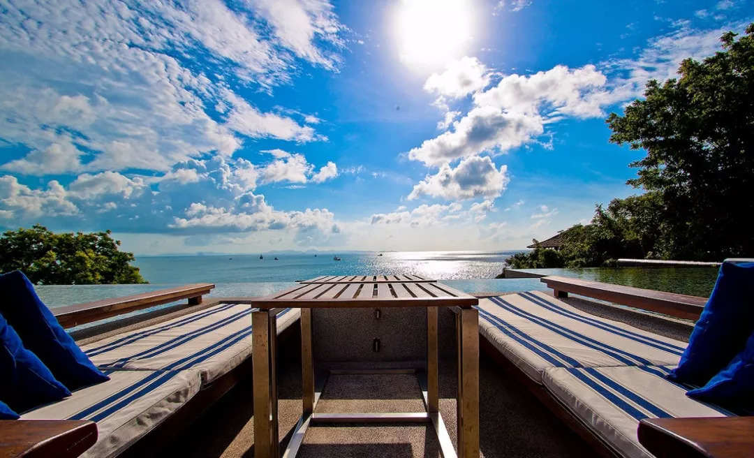 不仅如此,酒店恰恰位于海上悬崖,沿山面海,周围是葱郁的雨林和花草植被,180°蔚蓝的泰国湾海景,壮阔蔚蓝,绝对让你流连忘返。