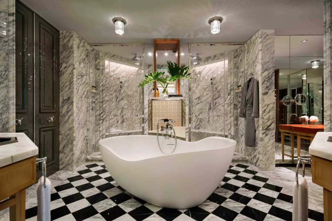 于是可以在香港瑰丽中感受到府邸式的居住体验,每个空间采用不同的墙面材质来区隔,如羊绒包墙、大理石贴面等,而地板、洗手台等设计又满是英伦复古风,双淋浴的设置不知会不会引领酒店新风潮呢?